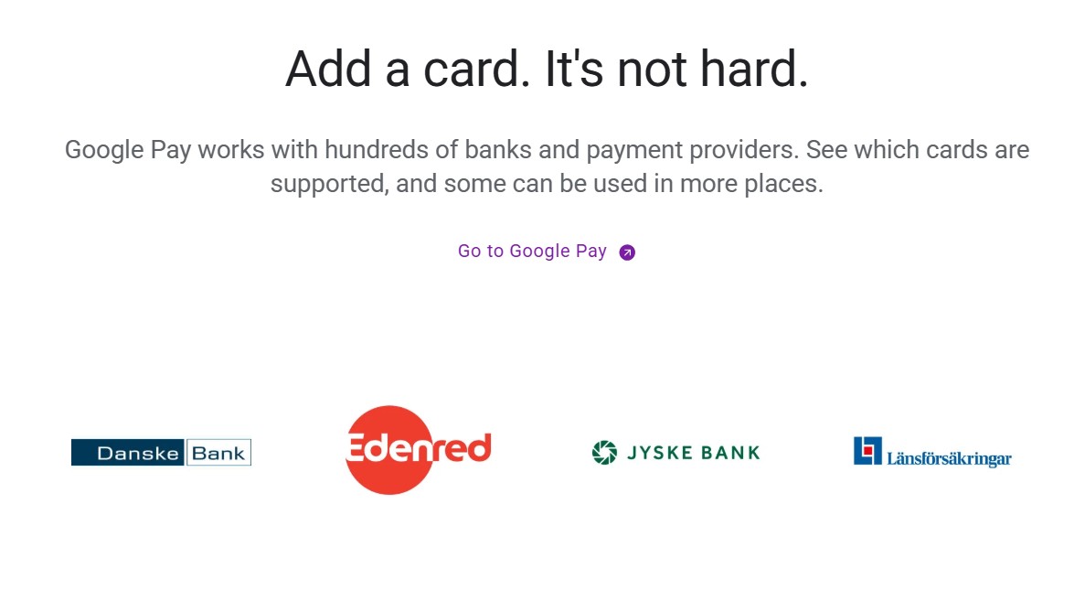 Google Pay i Sverige fungerar i första hand med debit- och kreditkort från Mastercard, Visa och delvis American Express för privatpersoner. De flesta standardkort från listade banker kan registreras, med några undantag:
