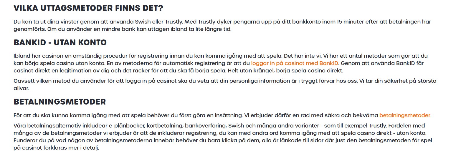 | Swish | Direktöverföringar via mobil, verifieras med BankID. Både insättning och uttag syns ofta inom minuter. Läs mer om Swish. |